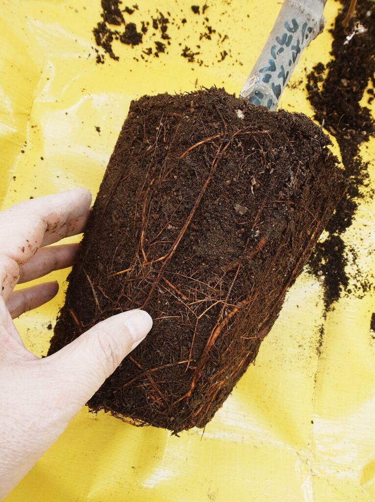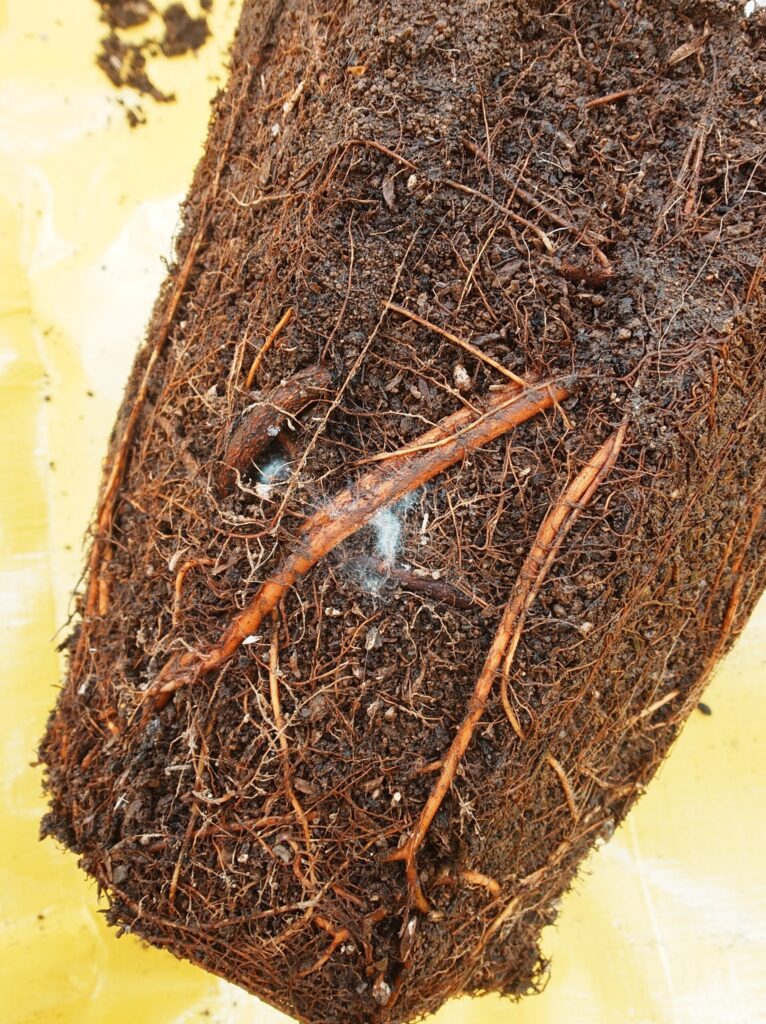 鉢からはスムーズに抜け、根は全体にしっかり張っている様子が確認できました。一部に白いカビのようなものが見られましたが、根自体は健全そうだったため、そのまま植え替えています。20