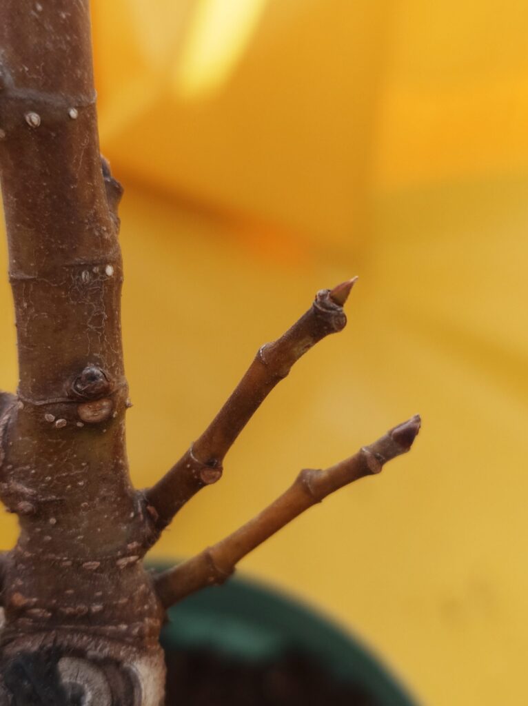 先端の芽はやや緑がかり、しっかりと締まって尖っていたため、無事に冬越しできたと判断しました。そこで、一回り大きいアップルウェアーの「根っこつよし 8号鉢」へ植え替えを行いました。